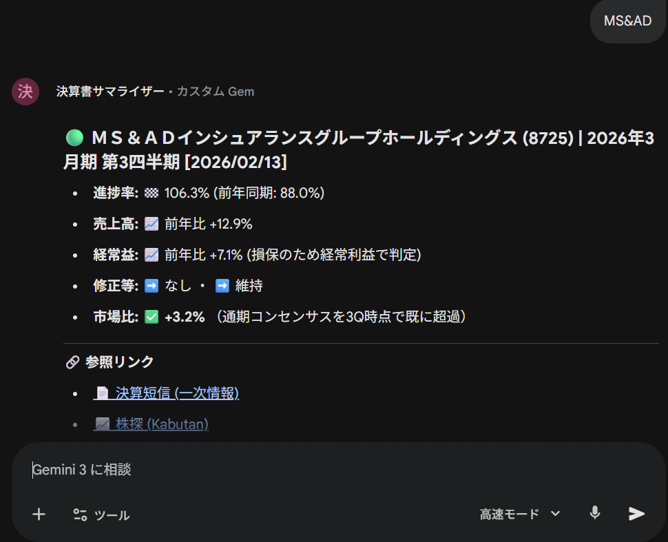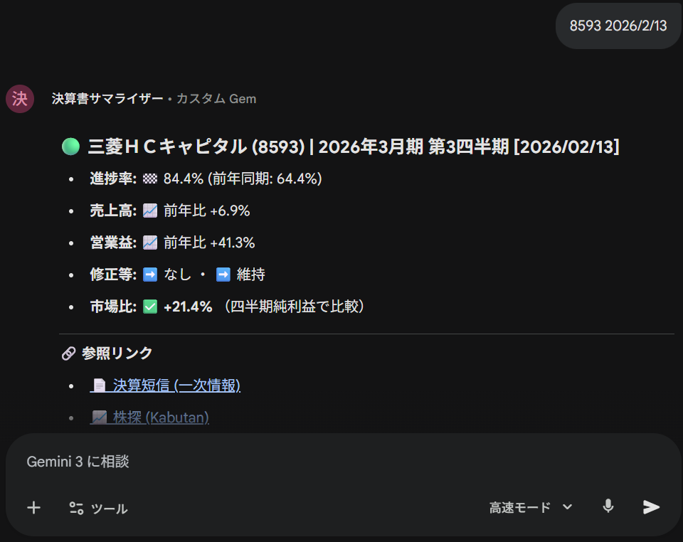 私はスマホのGeminiアプリにこのカスタムGemを使って、気になる企業が決算を出すとすぐ入力して確認するようになりました。
