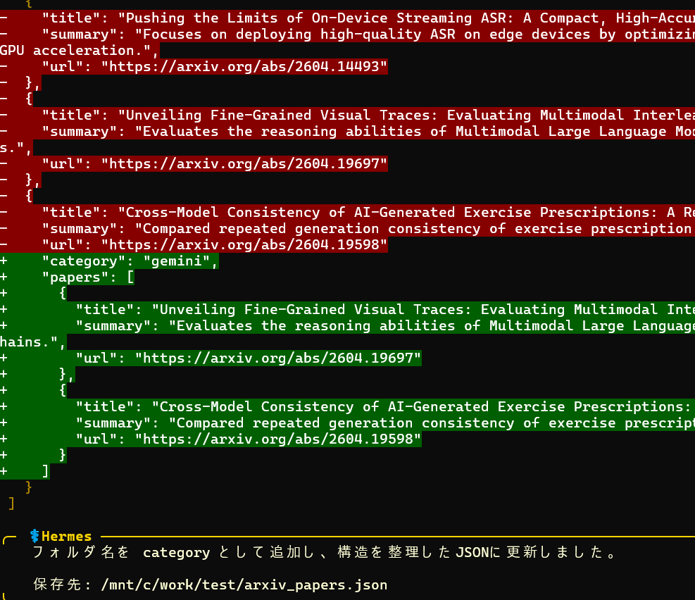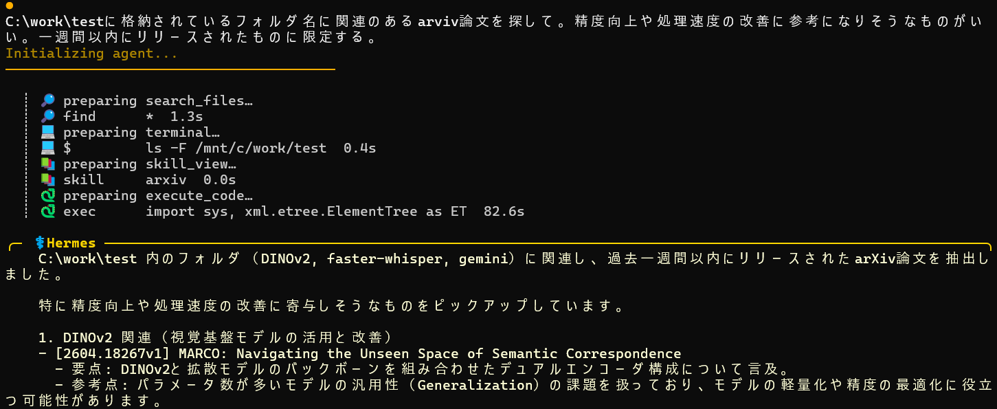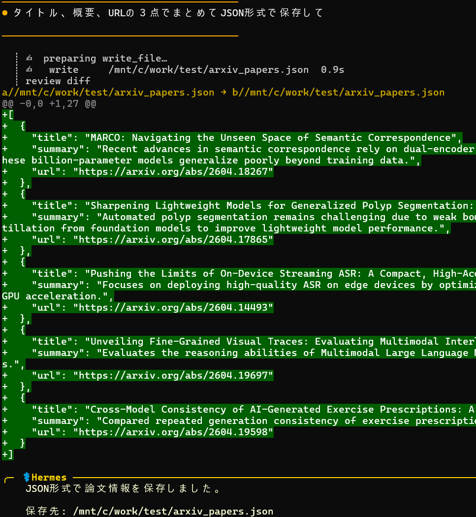 何か日ごろのタスクで定期的に行っているものや、自分独自の情報に基づくものがあれば、Hermes Agentを試してみてはいかがでしょうか?