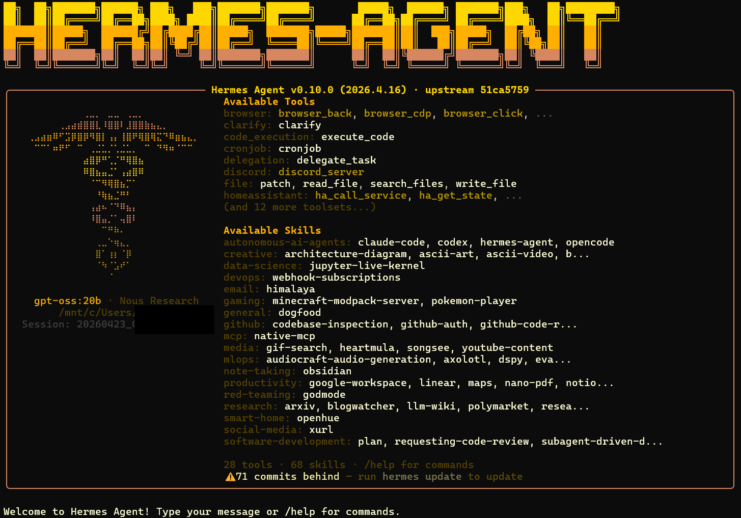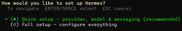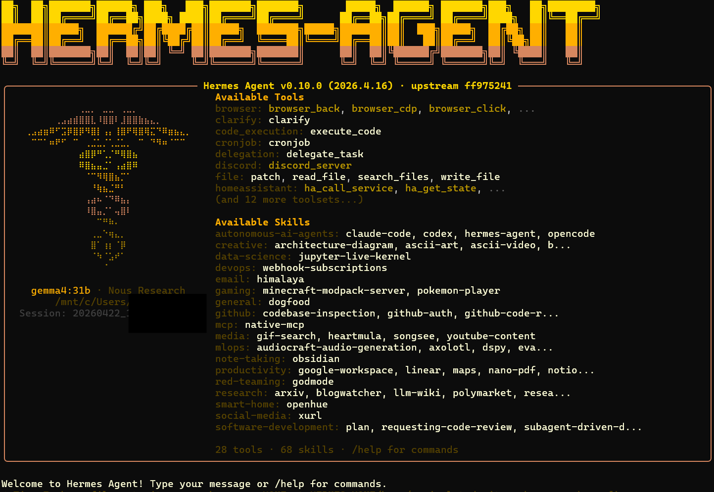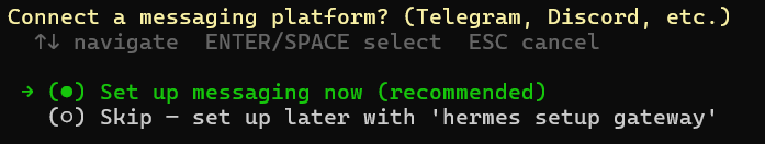 すべての設定、インストールが完了すると以下のようにHermes Agentが起動します。