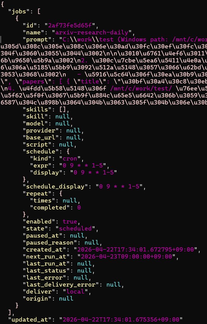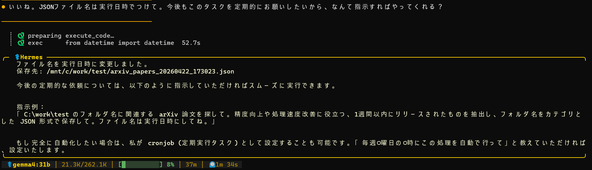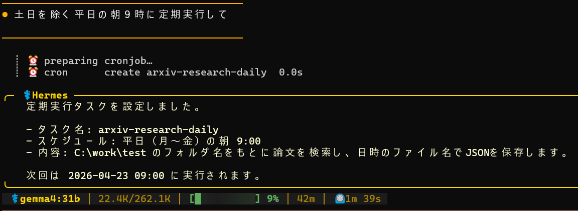 Hermes Agentの良いポイントとしてcronjob(定期実行)するタスクとして記憶してくれるので、このように提案してくれるのはいいですね。