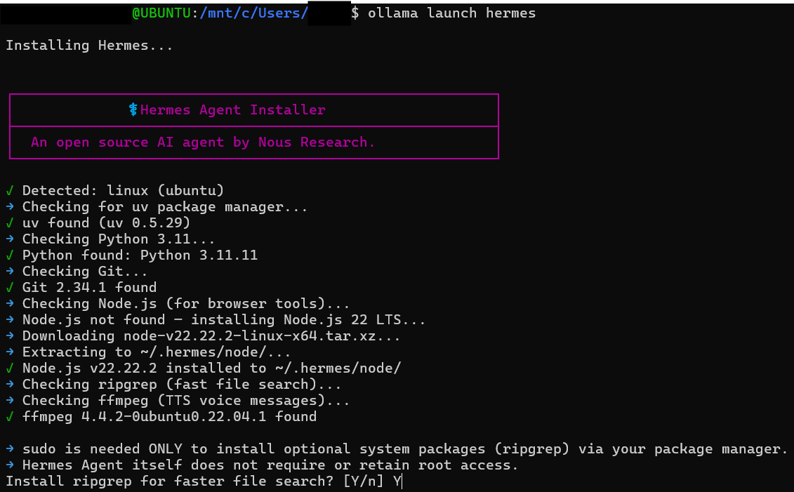 ollama launch hermes必要な依存関係のインストールが始まりますので、YesでOKです。
