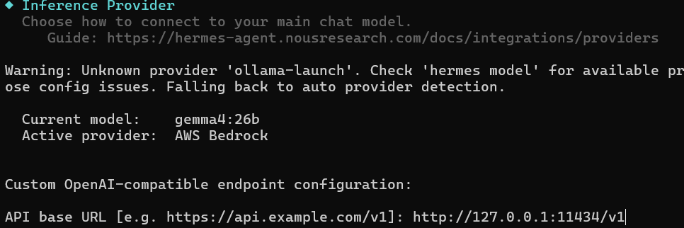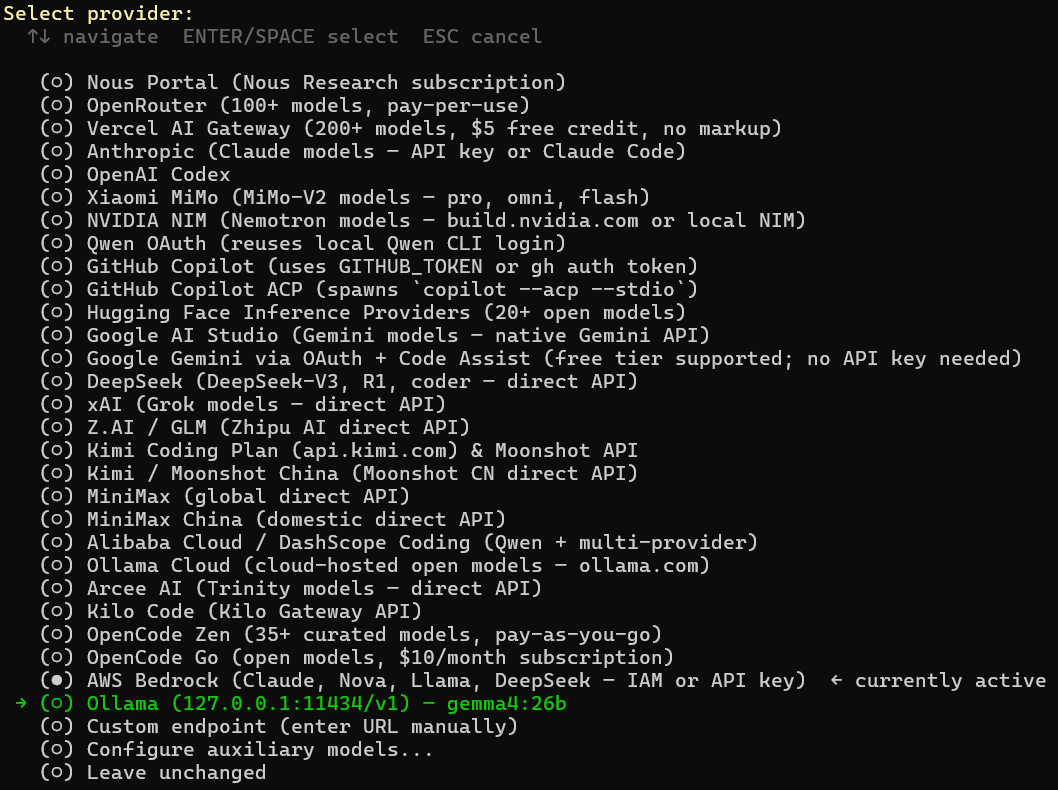 ollama pull gpt-oss:20bSelect providerからOllamaまたはCustom endpointを選びます。